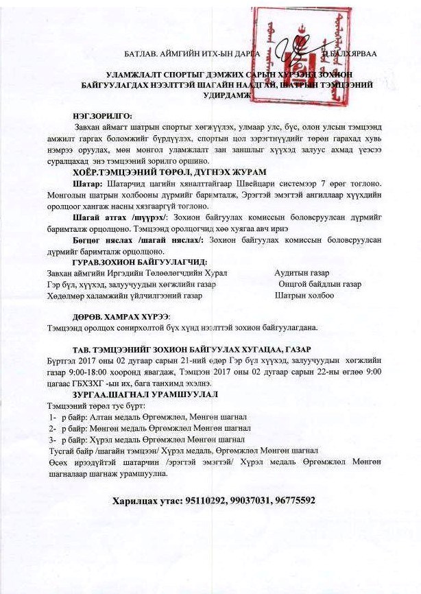 хяналттайгаар Швейцари системээр 7 өрөг тоглоно. Монголын шатрын холбооны